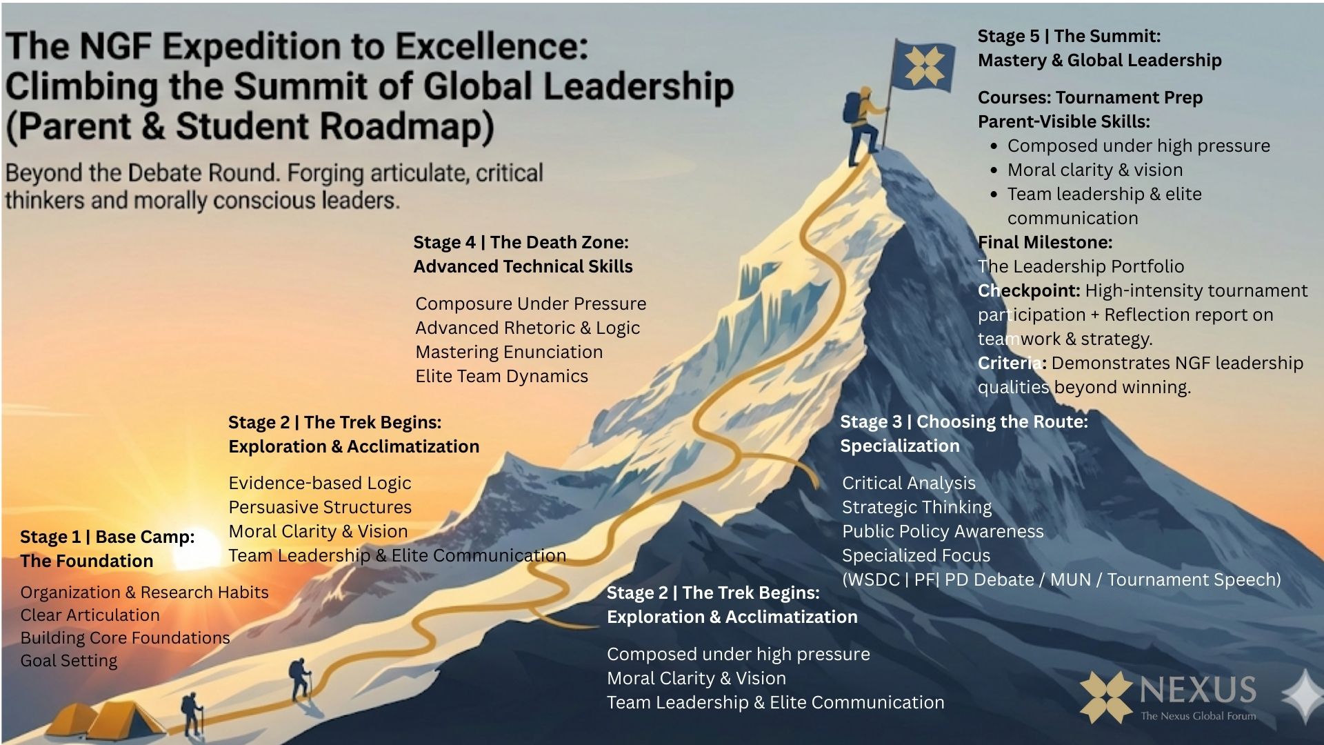 擁有傳播學碩士學位(以 GPA 4.0 的完美成績畢業),他極度專精於高難度的政策性辯論 (Policy Debate) 與公共論壇辯論 (Public Forum)。作為 NGF 的學術總監,他不僅親手培育出無數全國冠軍選手,更以極高的標準嚴格把關機構內所有的課程邏輯深度與教學品質。